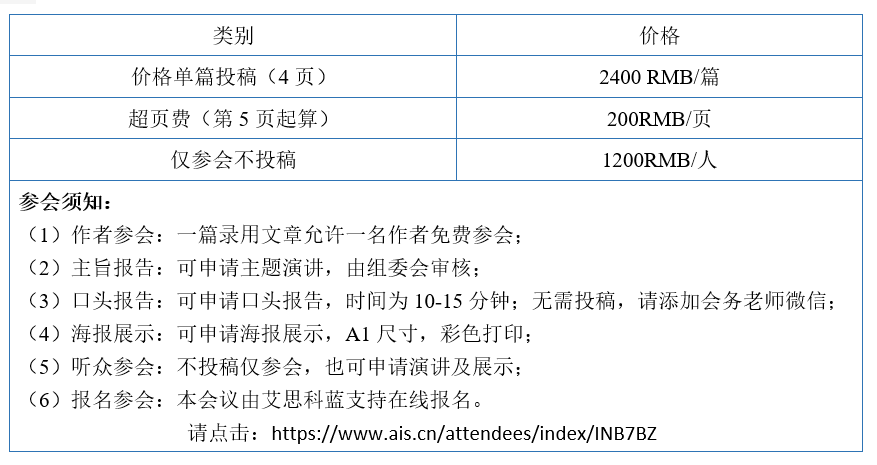 (1)稿件費(fèi)用包含出版、檢索、一本紙質(zhì)版論文集和一位作者參會(huì)機(jī)會(huì);不包含參會(huì)期間交通、住宿費(fèi)用;